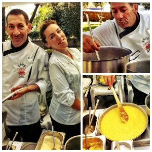 Her iki kültürün aşçıları yanyana standlarda risottoyla keşkek, polentayla kuymak, mantıyla ravioli, ricottayla lor tatlısı gibi birbirleriyle benzer tatları sunarken ünlü şefler de tanışma şansı yakalamak çok keyifliydi. Cento per Cento şeflerinden Enzo ve Elif Aslı ile bir yandan italyan mutfağı üzerinde sohbet ederken, bir yandan da safranlı risotto yapımının püf noktalarını paylaştılar. (Merak edenler için iletiyim 🙂 suyunu çektikten sonra tereyaği ve permesan peyniri ile kıvamını yakalar yakalamaz hemen ocaktan alıp servis yapıyoruz.)