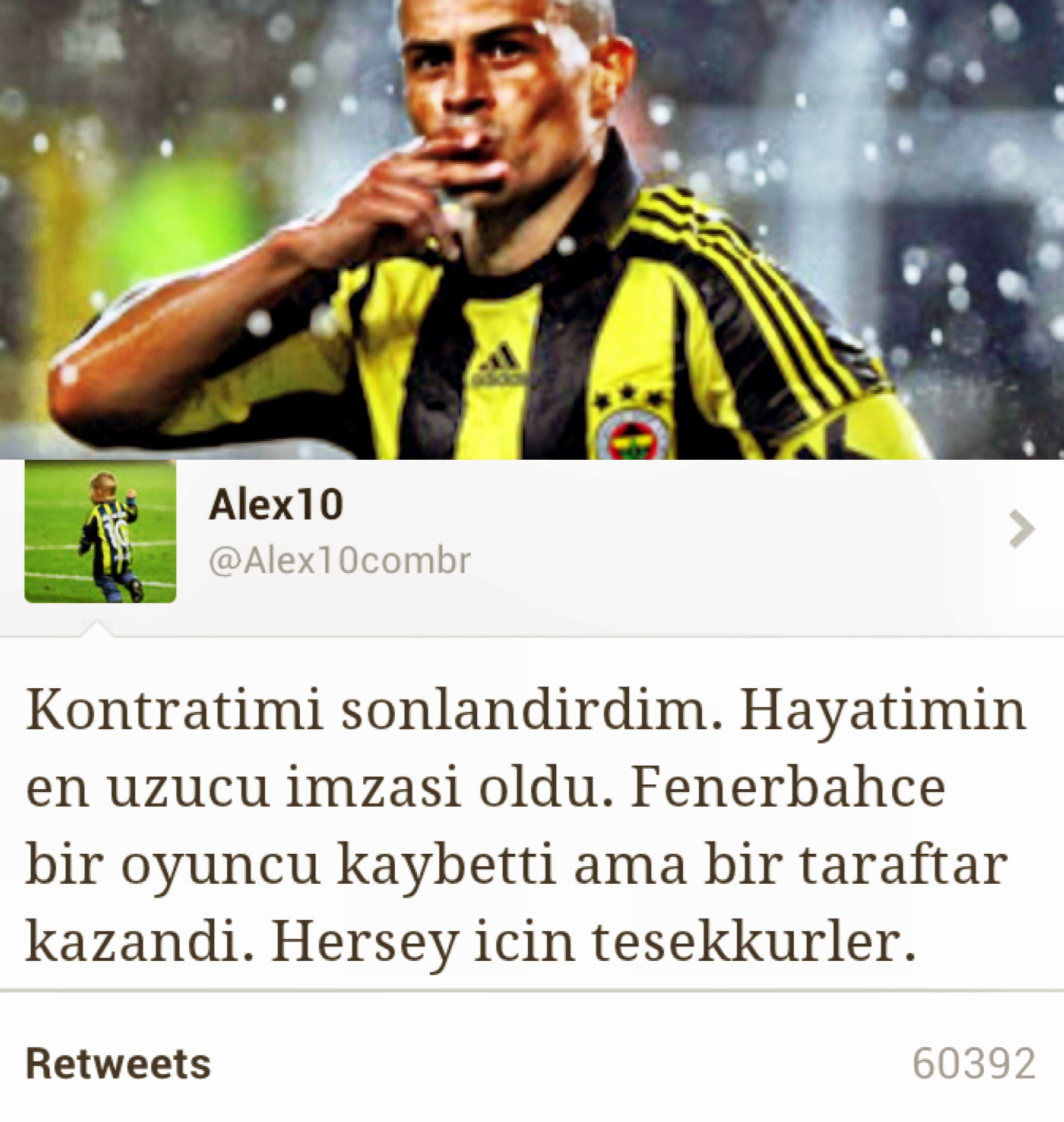 Fenerbahçe’nin efsane futbolcusu Alex de Souza’nın ülkemizde geçirdiği sekiz yılın ardından kontratının sonlandığını bildirdiği Twitter iletisi, şüphesiz Türk futbolu adına tarihi bir olay olarak kayıtlara geçti. Alex ardında bıraktığı onlarca başarısının yanı sıra, bizlere veda ederken bile aslında bir rekora imza attı.